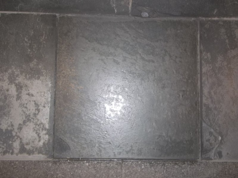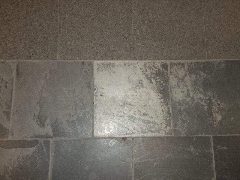 I agree with Mike.....I have never seen a totally "black" slate......being natural stone it is obviously going to have "varying" tones / color.....also I do recommend using a 175 floor machine outfitted with a "medium bristle" / blue sometimes grey in color depending on the manufacturer....however, be very careful in the abrasiveness of the brush (eg. Nyla or map grit) as they can put " swirl marks" in the stone just like Mike is referring to that could be hidden by floor finish.