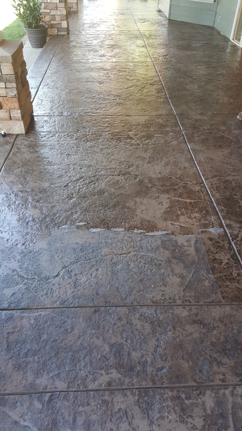 Stamped stained concrete. It is 3 years old. Total of 4 coats of sealer. After I scrubbed and rinsed it really didn't need another coat but since it was prepped I put one on anyway. I used a product called Master Kure. Solvent based acrylic curing sealer. It is theist forgiving coating I have ever used. The floor picture had been previously coated but the vertical wall had not. Pretty good uv protection. 100 for 5 gallons. I did 1800 sf with 5