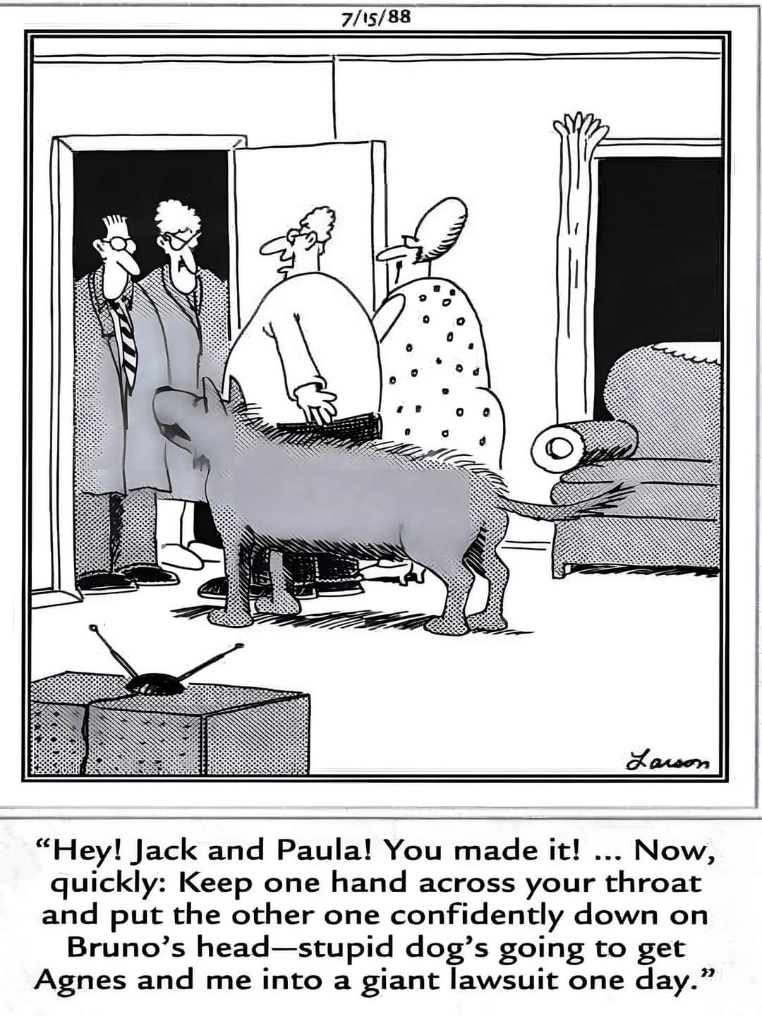 Well, the 100 lb dog's love nip is a heck of a lot more of a nip than my 12lb dogs. It didn't break skin but it stung quite a bit. I maintained my composure and continued to greet the dog and be friendly but I could tell it concerned them and made them a little uncomfortable. I assured them it was fine and they did their due diligence informing me about it. It ended up being no problem.