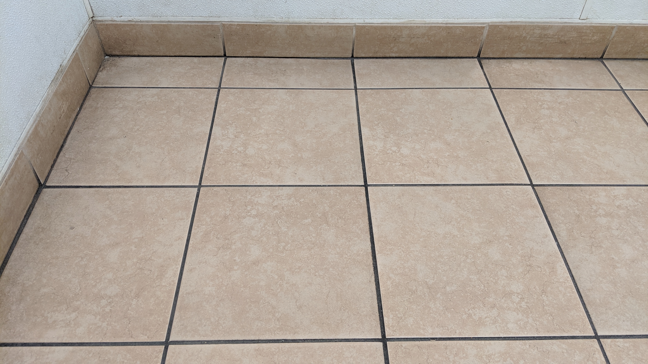 Dye the rest of that white grout on the top of the trim to black. Then clean the floor with a Neutral cleaner to get the piss off the floor at only 500 psi on your tile wand