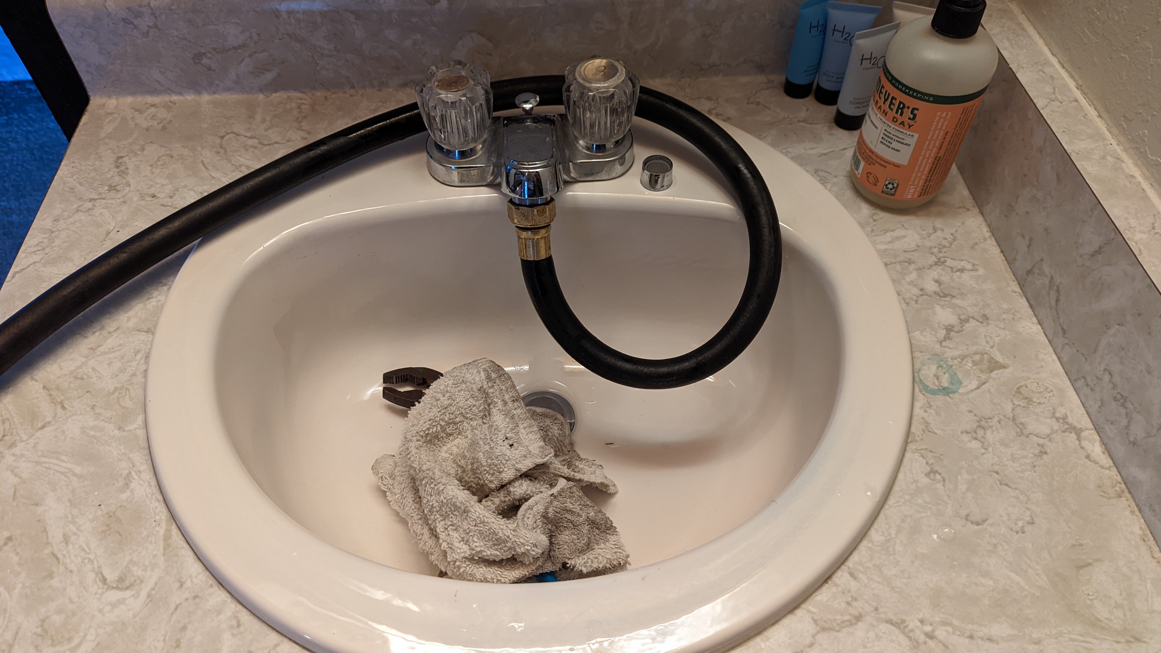 Put that spotting towel over the faucet spout.