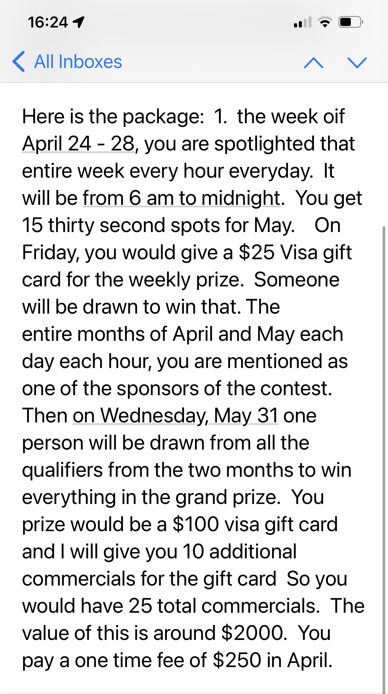 As part of a larger campaign, the $250 sounds like it wouldn't be much of a risk. It does help with brand awareness if your overall strategy is a long term plan. We advertise on a number of different radio stations that cater to a variety of people. Not looking necessarily for instant return, just keeping our name relevant for when they are in the market for cleaning.