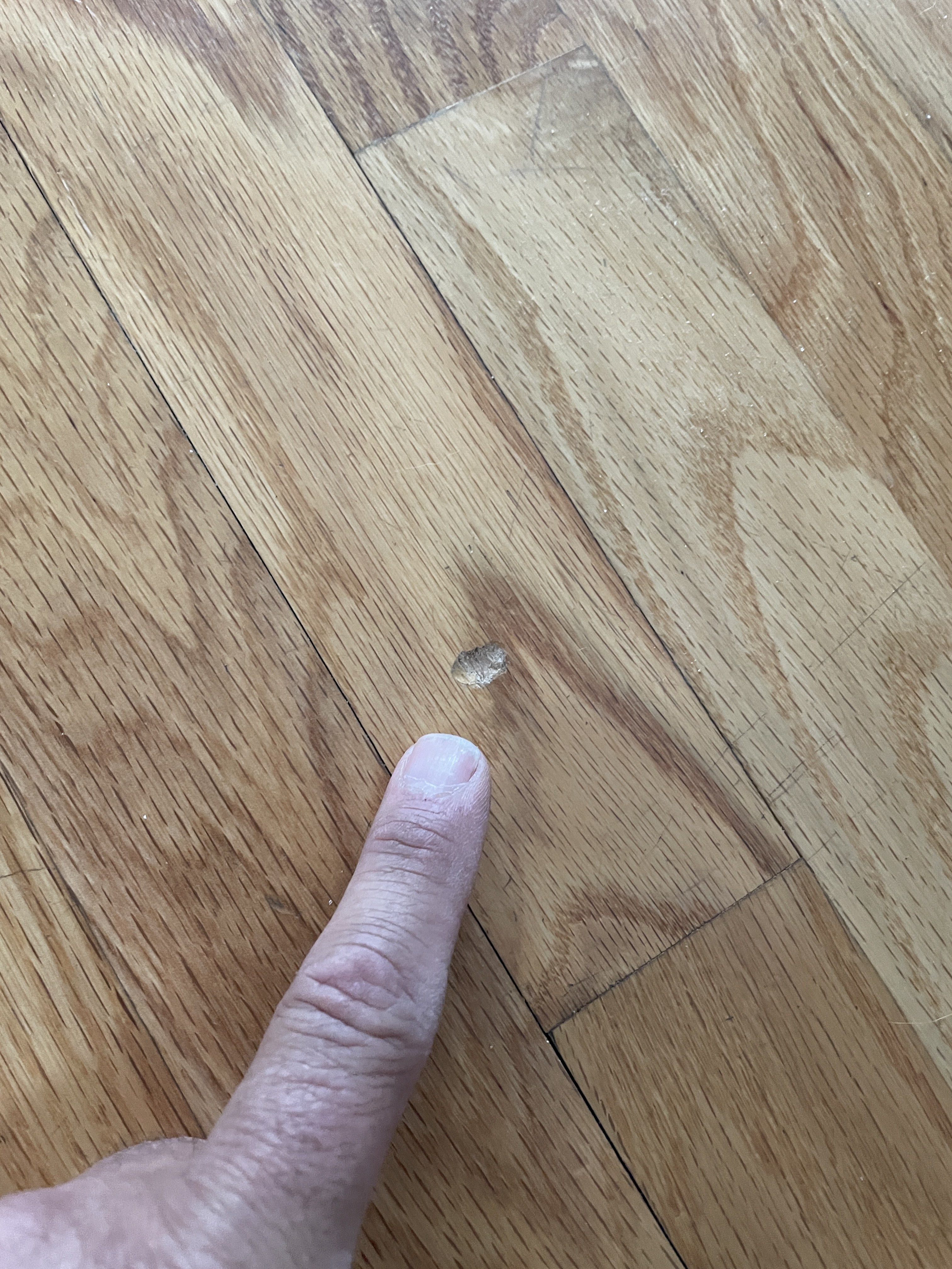 I DEFINATLEY could have not said anything, red oak floor with knots and some scratches. But I made it a good situation when I told her and she took me up on fixing it. Called an awesome carpenter and he came over as I was still cleaning. He had a pencil wood filler, the lady was over the top impressed about my response.