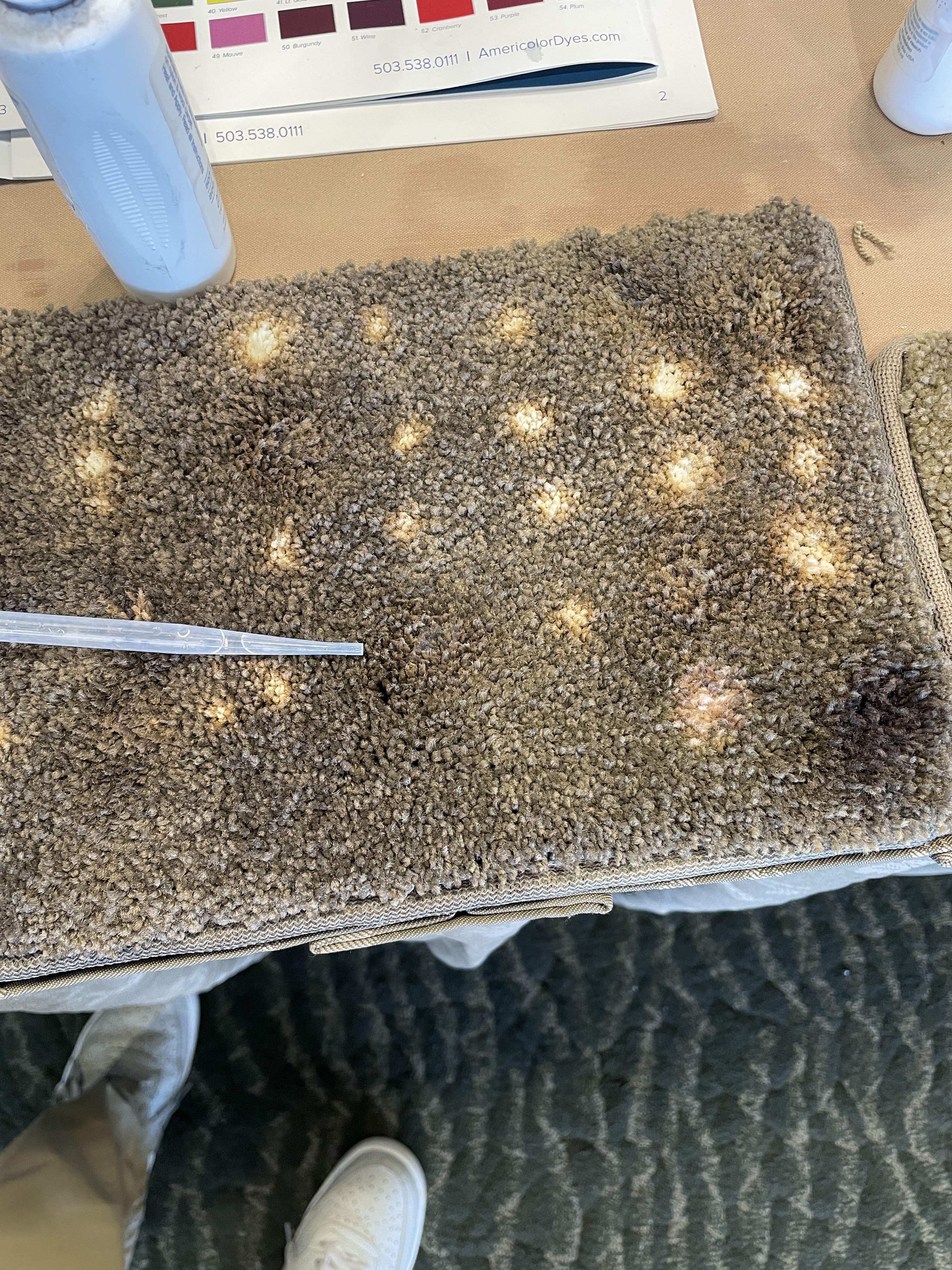 So Melody Davis, Americolor taught me how to dye carpet. The carpenter had a darker shade and a lighter shade on his truck than what I would have used, and we went darker in this case because it "Camos" in with the knots.