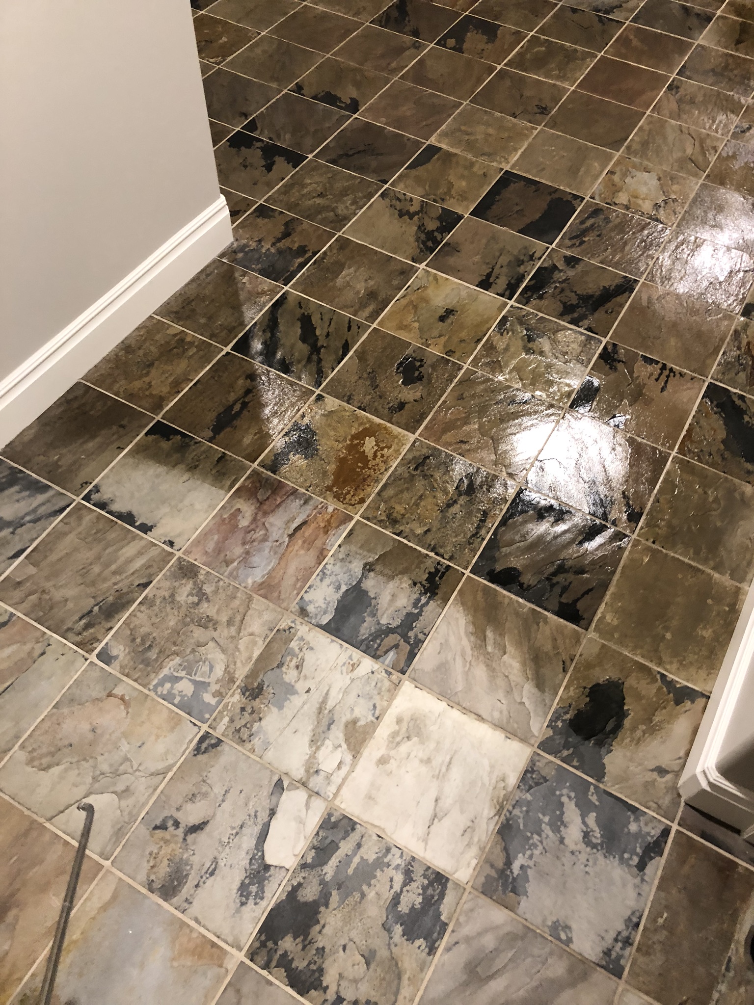 Sorry about the lack of details, my little guy (20 months old) was trying to rough house with me while writing this up. I started with a light emulsifier in the cimex while shower feeding it onto the slate. Then I used our tile wand to clean at around 500psi. Did not need to be stripped. Used my battery pump sprayer for the pure solvent sealer (I believe advanced?) it was about $160 a gallon and used the microfiber mop to spread it evenly on the tile. Learned a lesson, don’t use battery sprayer for this, almost ruined it. Customer was extremely pleased with the final results and so was I.