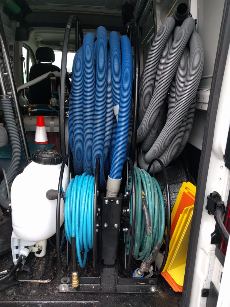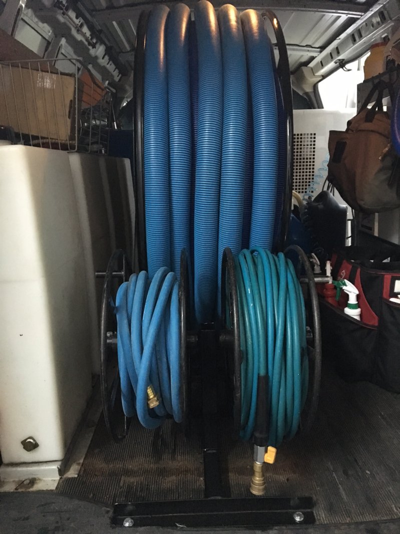 Don't you guys find your solution hose reels take up to much space. I have always found it easier to coil and hang my solution hoses and it gives me more flexible space for other items. Also for residential jobs, I have a 100' coil and a 120'coil hanging just inside my sliding door. I quickly grab whichever one is most appropiate and brin it in with my hydroforce and begin uncoiling it to the truck. I find with a reel, you usually unreel so much to bring inside and the drag the rest across the ground. Seems like more work.