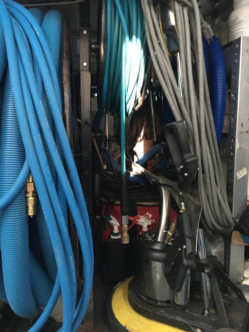 It's on the vac reel now which makes getting some of the floor machines in and out a pain. The water tank was mounted at the rear of the van (that's where it was when I bought it) so it pushes the vac reel over a couple of feet and puts the solution reel directly over the space for the floor machines.