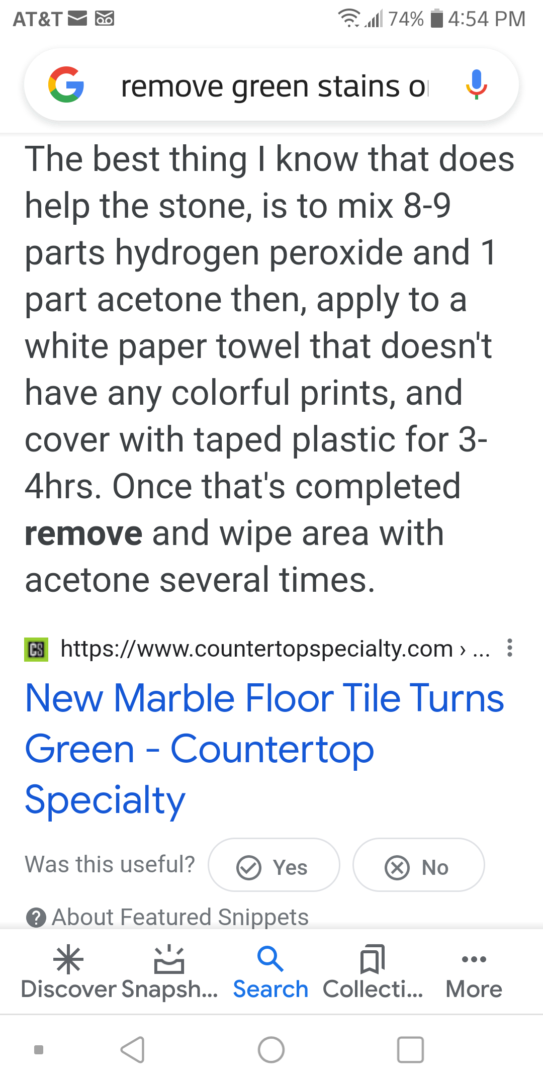there's a marble green bloom glue stainer remover I'm going to try, says could be caused by adhesive....alpha stain remover did react like it was rust but didn't lighten it at all...
