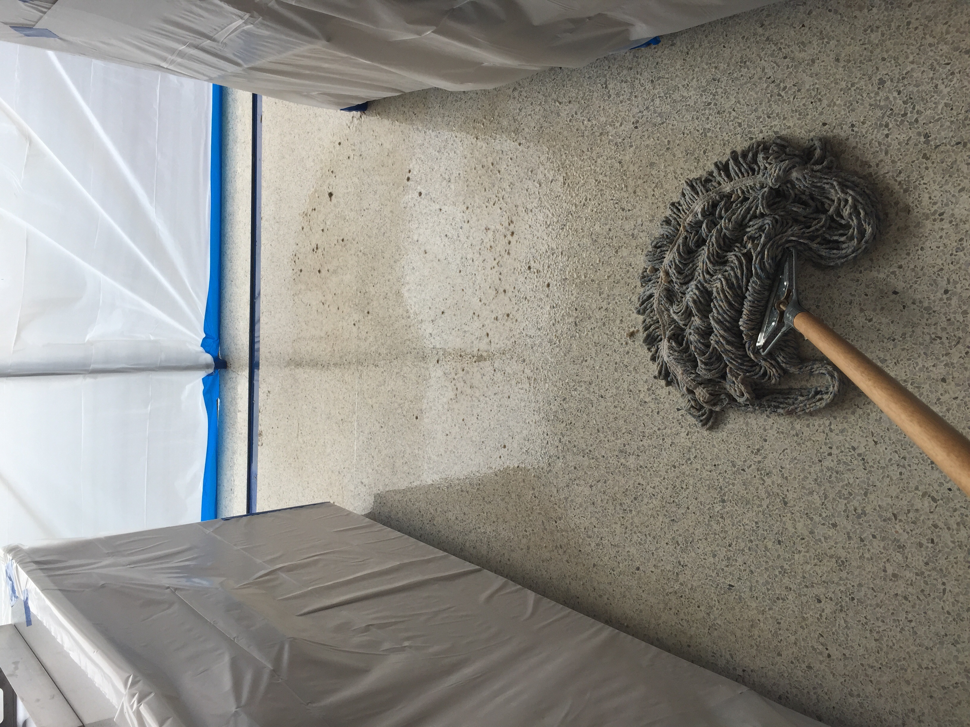 The Terrazzo has some sort of sealer on it. Thinking a polyurethane coating. Floor has yellowed and has layers of wax/soil/sealer combo.