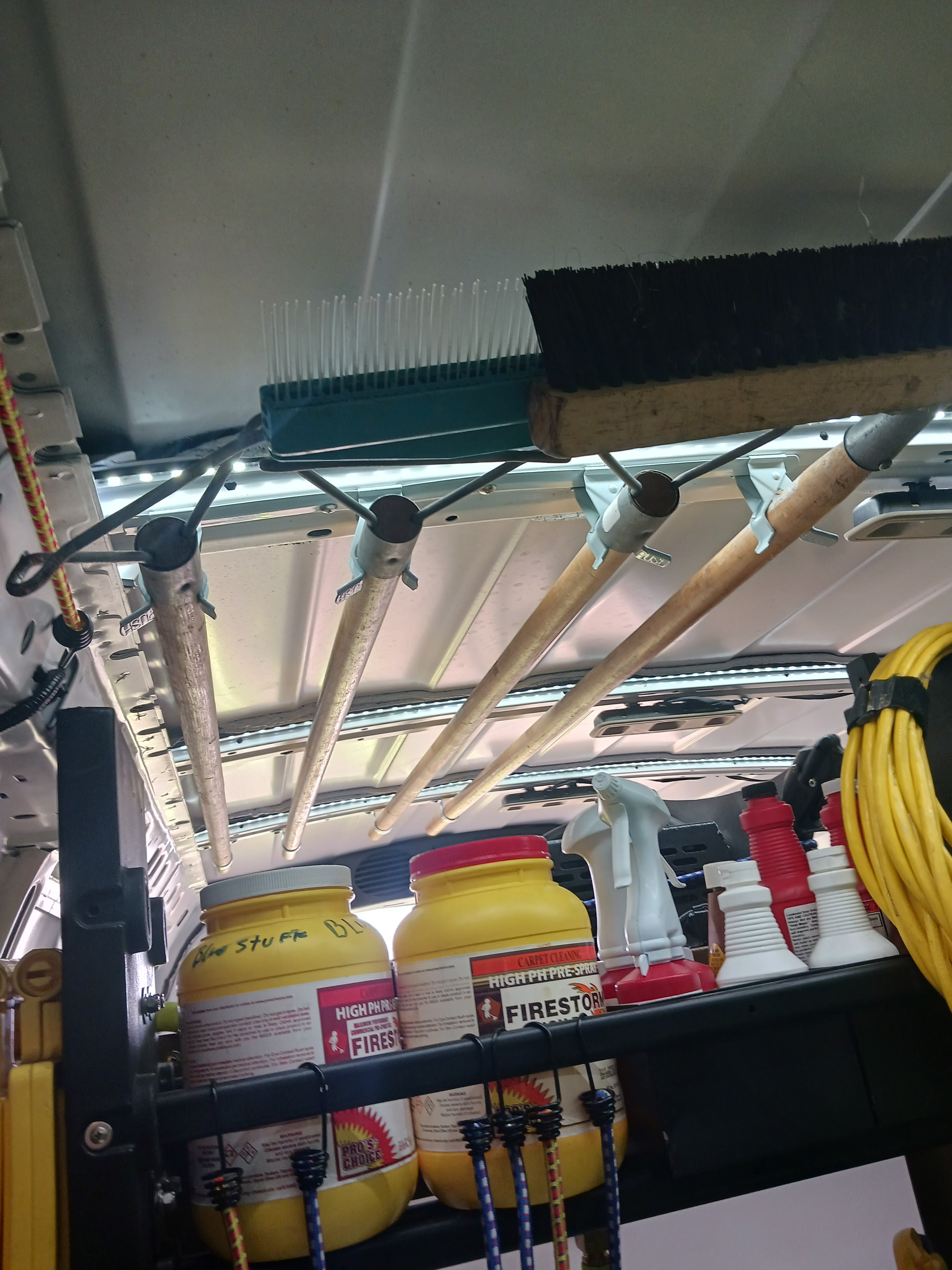 we'll see, it's already installed i tried pulling the rakes out, it takes some effort, the springs are real strong. I did mount the track on the forward rib so i can if necessary mount those velco strap mounts on the back rib of the roof stringer, meanwhile i think the velcro strap mounts will come in handy in mounting the tile spinner to the roof. I ordered the hydramaster wand mount system, my thought is to use 1 of them to hold the spinner end of the sx15 and 2 of the velcro straps for the handles so thank you for the idea ill post pictures when i get it up there, also i intend to mount a gekko tile handle and a scrub wand somewhere in the van ill post the results thanks for the input and advice